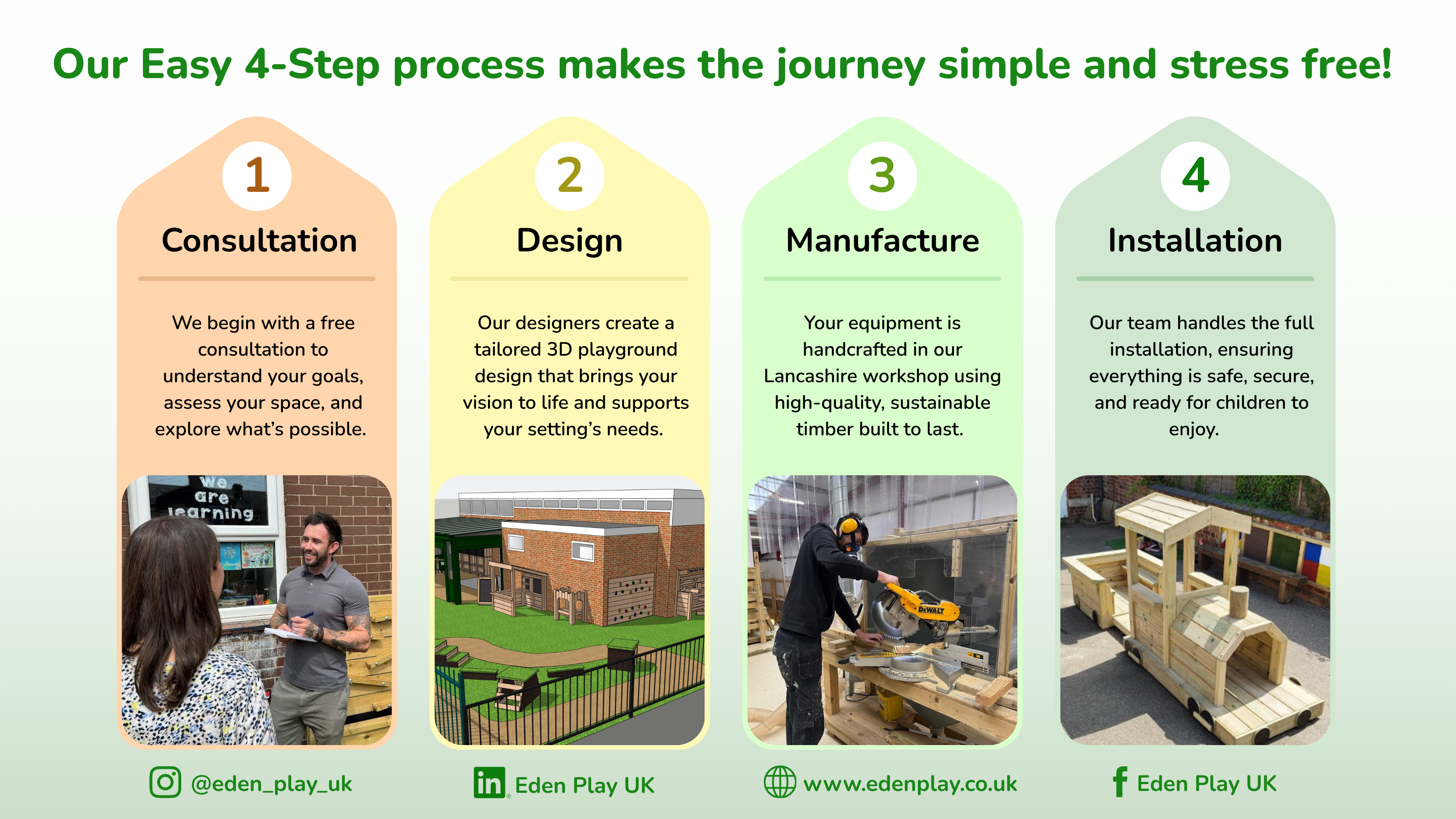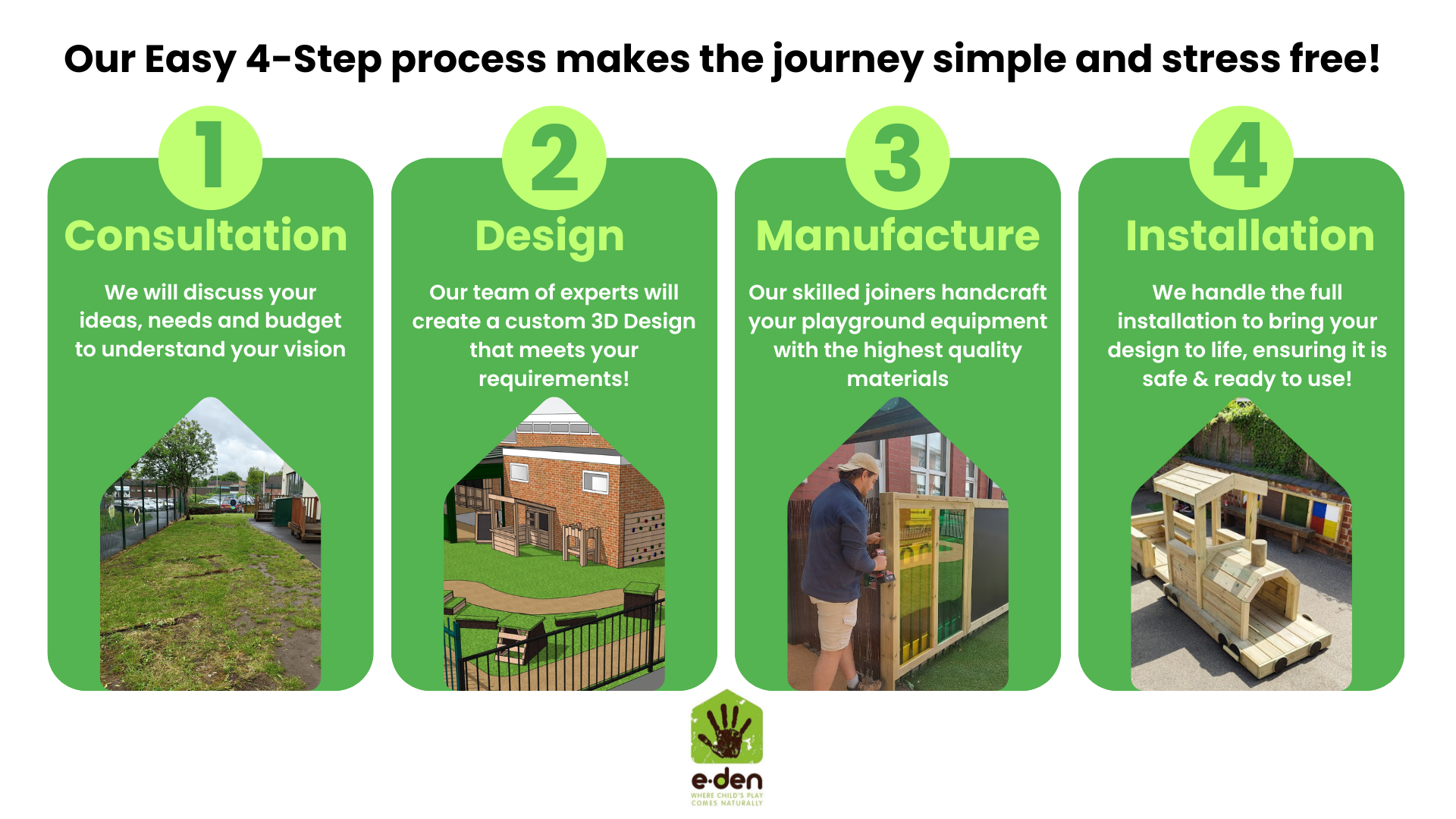 Eden Play is a family-run business passionate about creating engaging and high-quality outdoor learning environments. Their dedicated team of experts offers a comprehensive playground design service, ensuring that every aspect of your outdoor space is meticulously planned and executed.